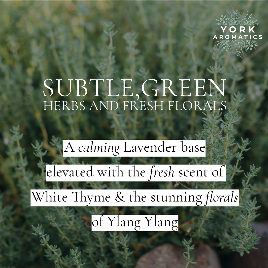 A sophisticated fusion of lavender’s calming purity, white thyme’s crisp herbal clarity, and ylang ylang’s exotic floral warmth. The fragrance opens with invigorating green and citrus notes, awakening the senses with freshness. As it settles, the floral heart deepens — lavender and ylang ylang entwine to create a sensual calm, while white thyme adds a clean, modern edge.